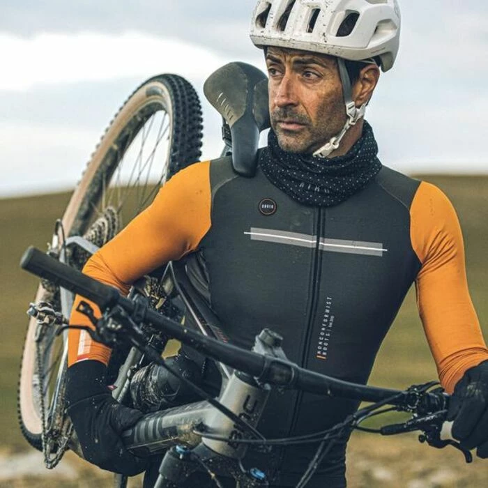 Jersey à manches longues et moulant, sa combinaison de lycras en microflece contient un traitement anti-eau DWR (Répulsif durable pour l’eau), qui agit comme une barrière empêchant les gouttelettes d’eau de rester à la surface du tissu, ce qui fait glisser les gouttes de pluie pour un séchage rapide. En outre, il intègre des panneaux supplémentaires dans le tissu en maille ultrasudorifique dans la zone des aisselles pour une ventilation supplémentaire.